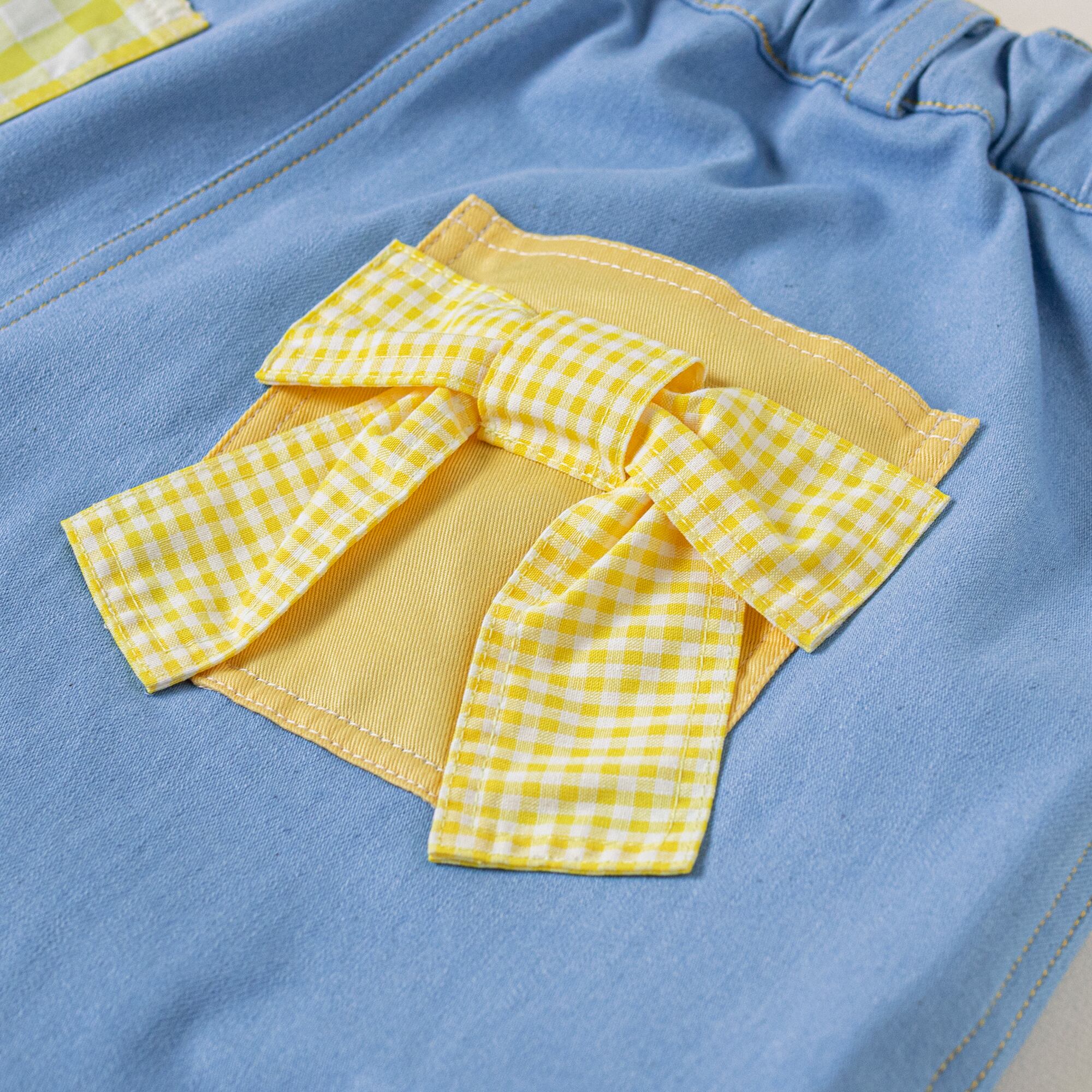 We made cute denim pants with red gingham fabric peeking out here and there.