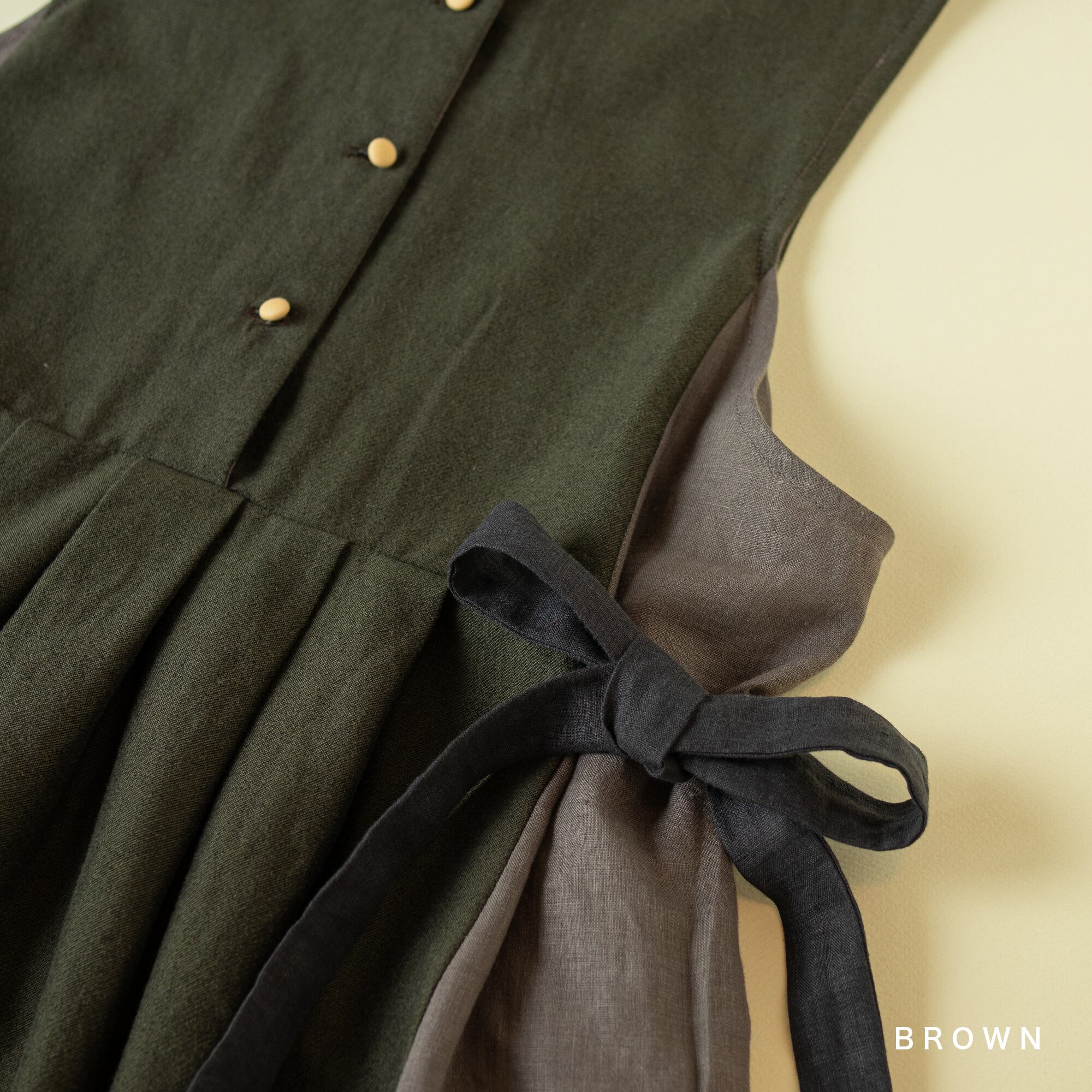 Sleeveless type that can be used in all seasons. The cuffs are wide so that it can be layered with thick knits or blouses in the fall and winter.