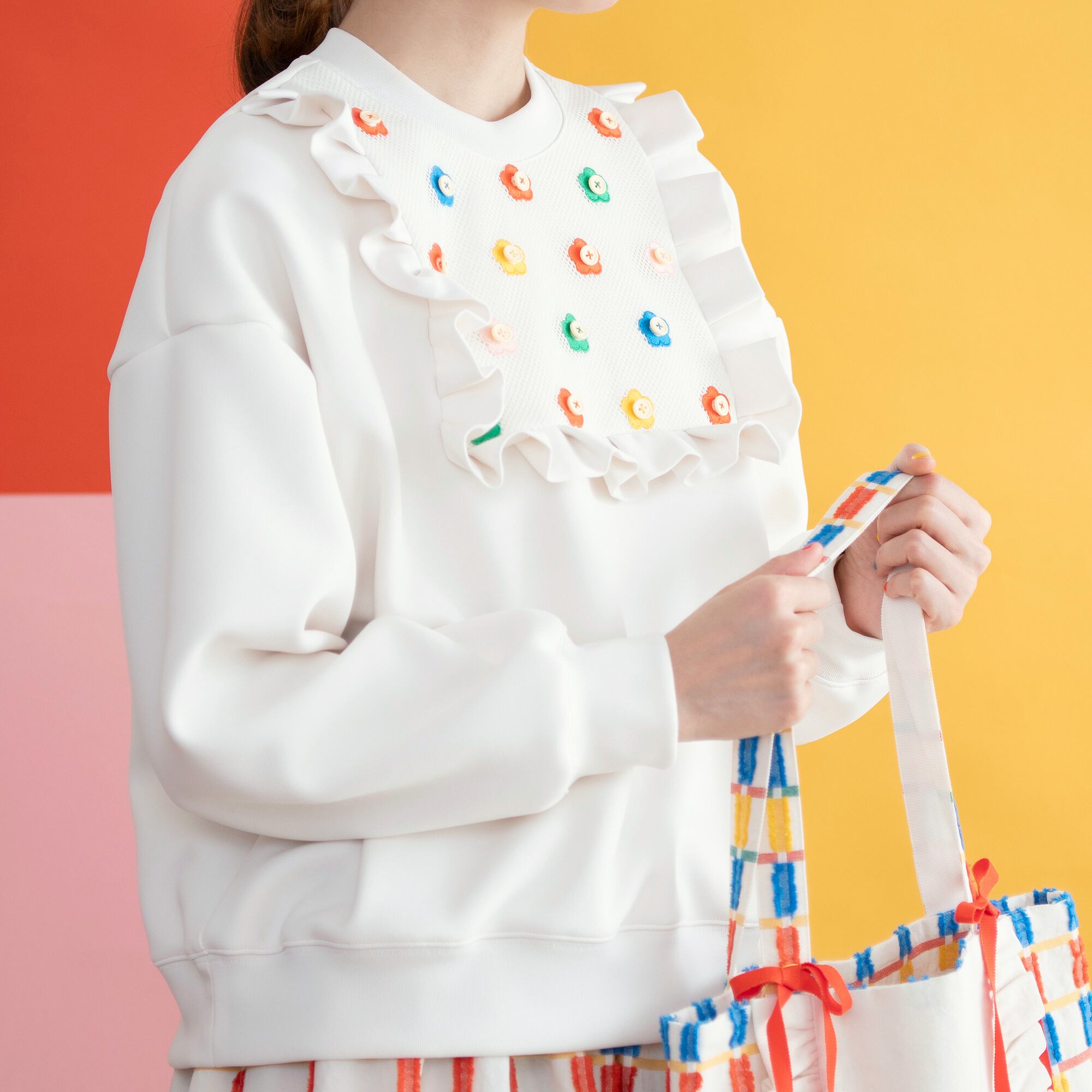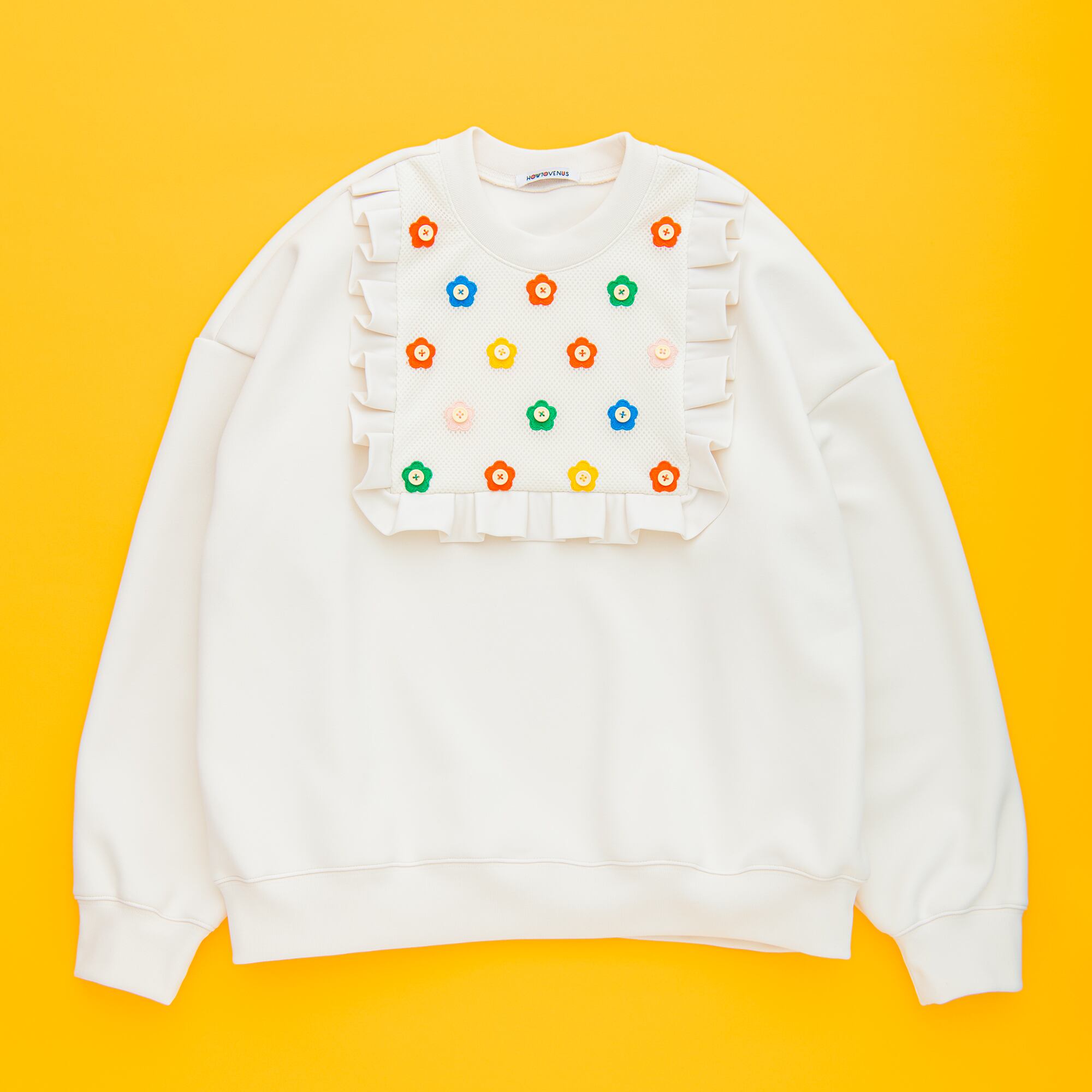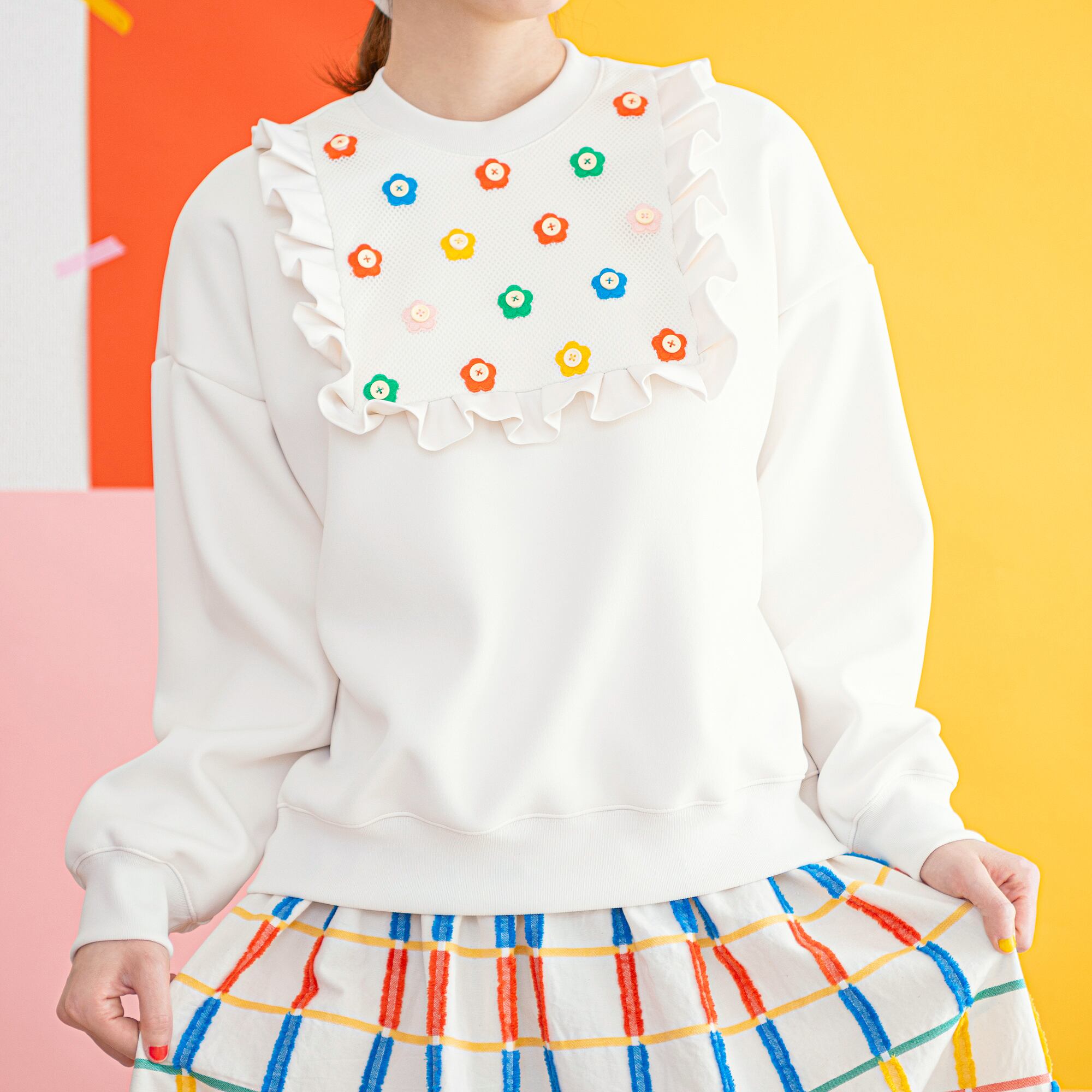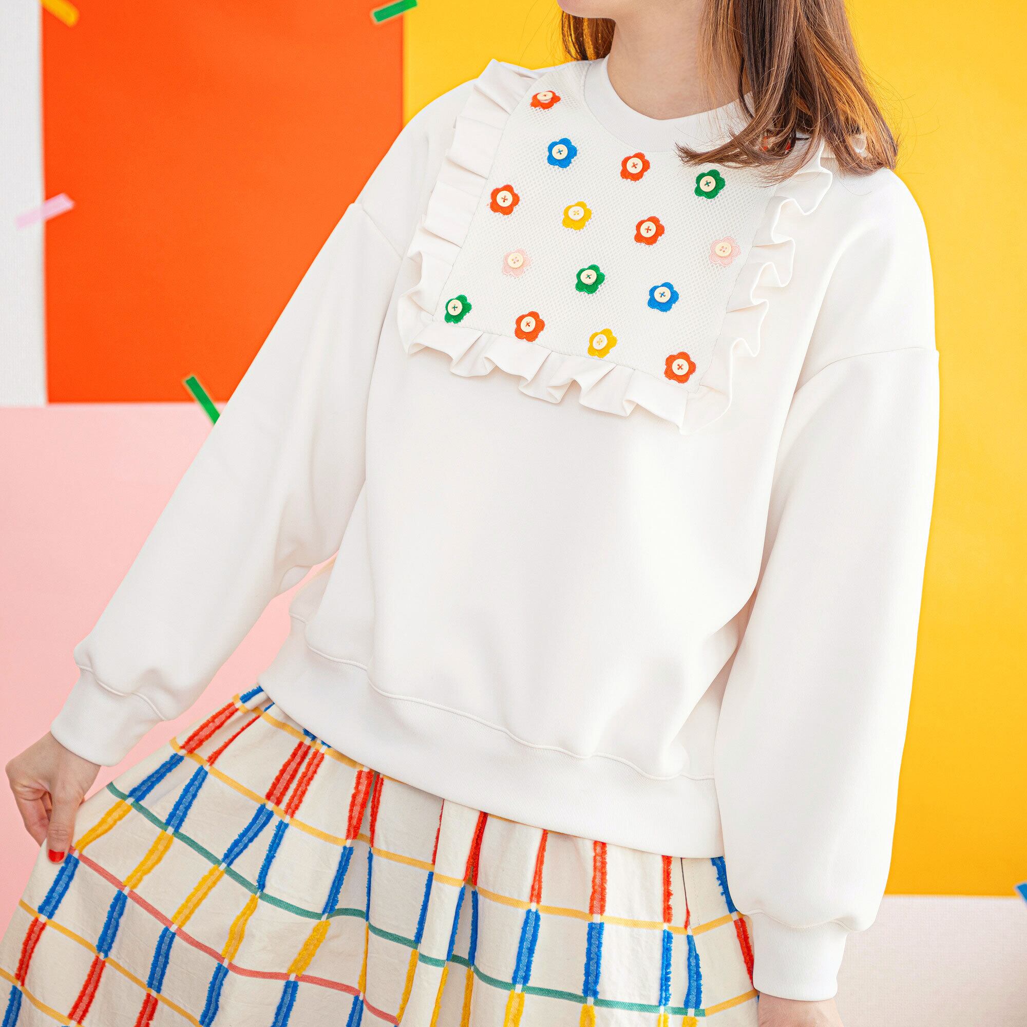 We made a cute sweatshirt with flower embroidery and buttons on the chest!