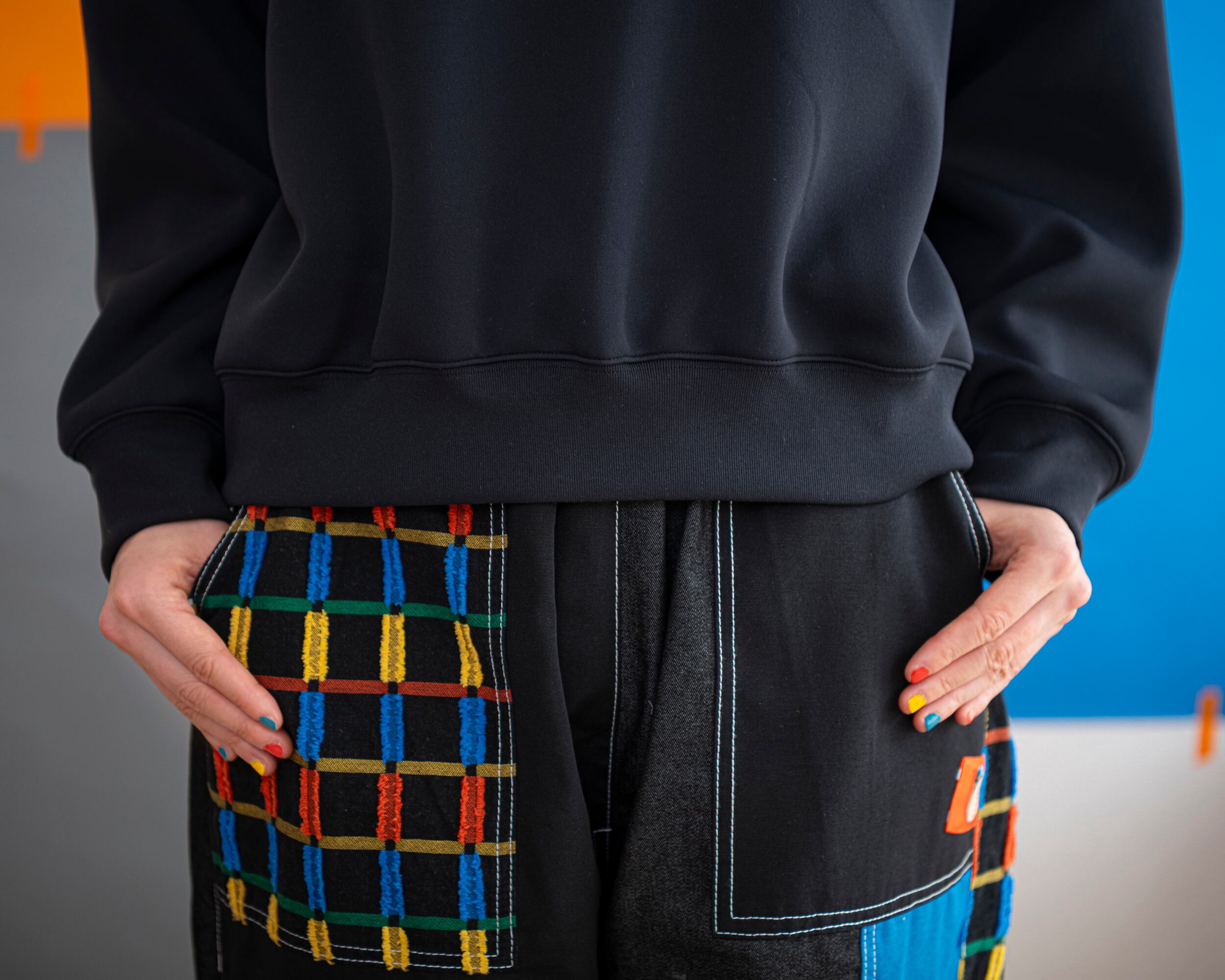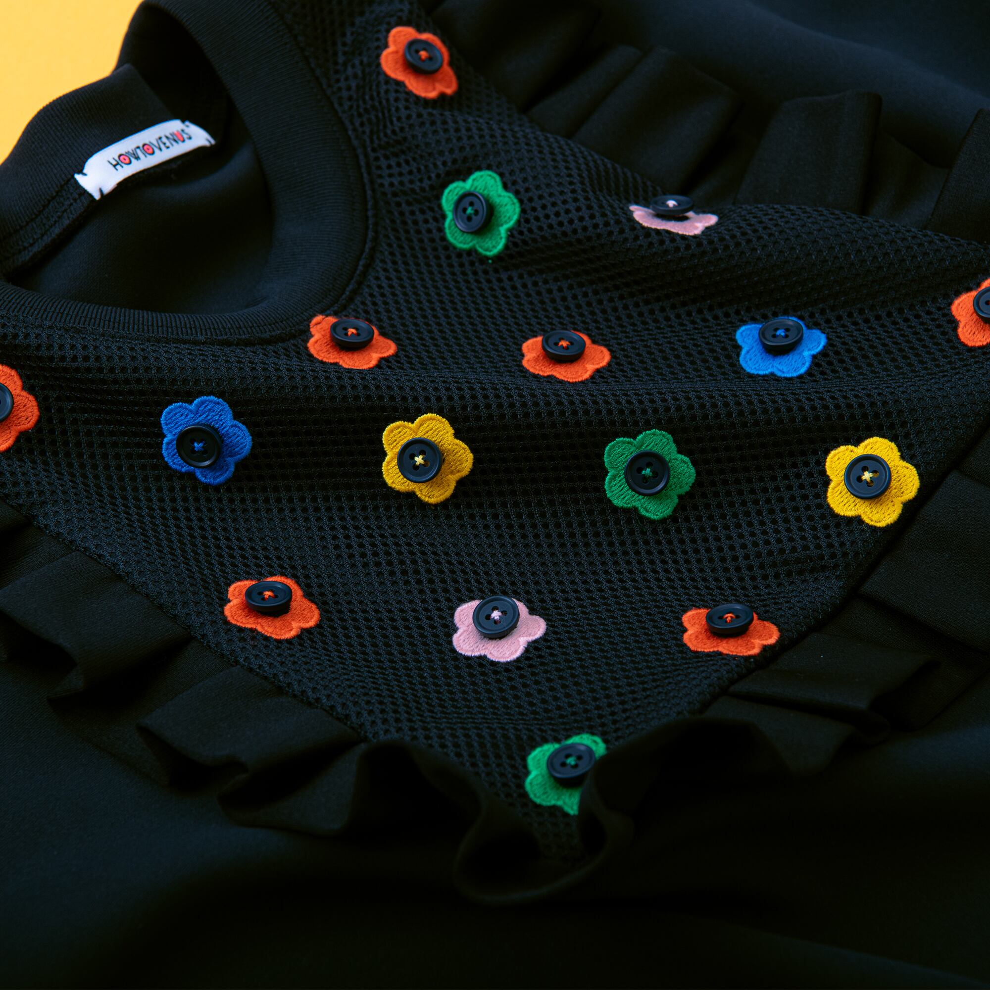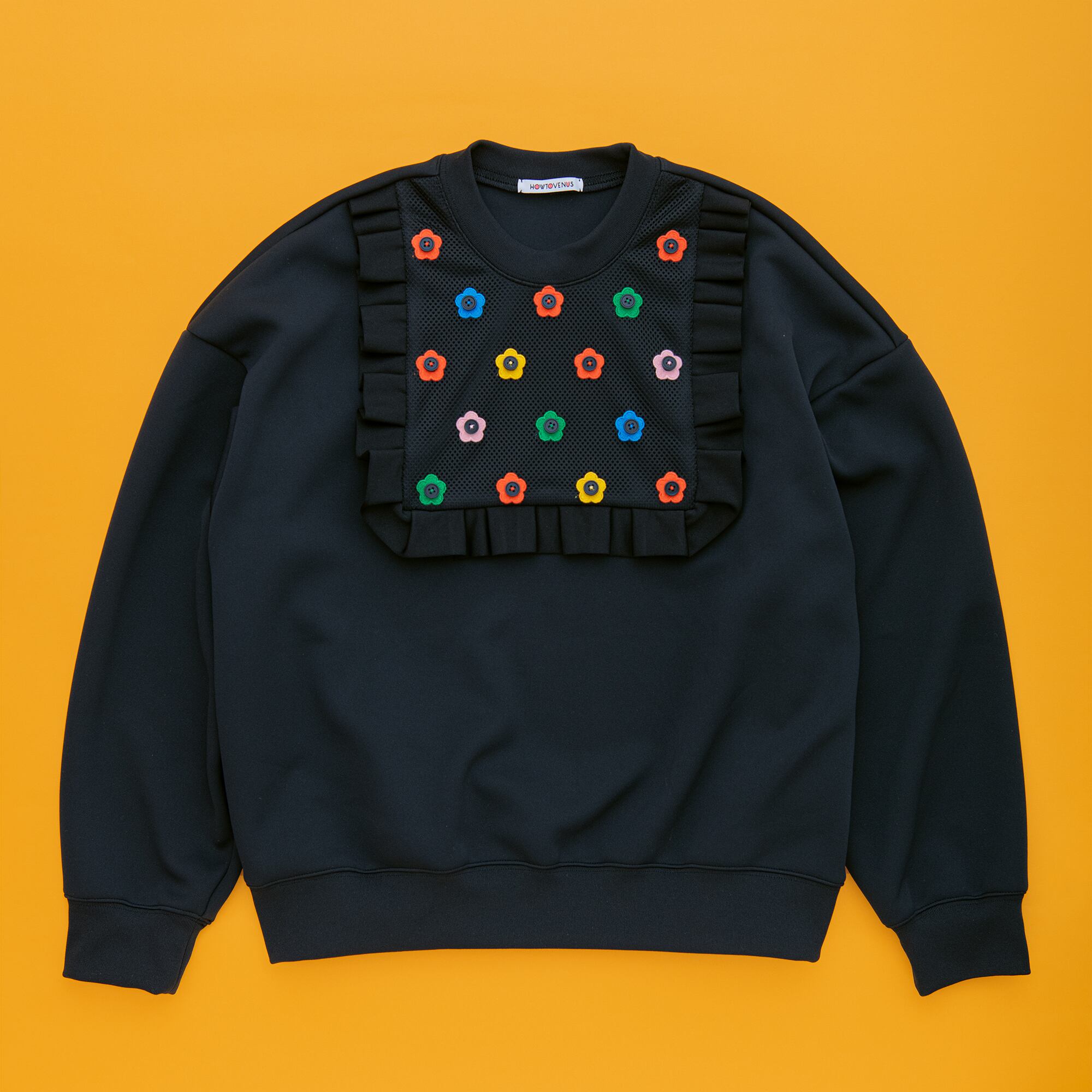 We made a cute sweatshirt with flower embroidery and buttons on the chest!