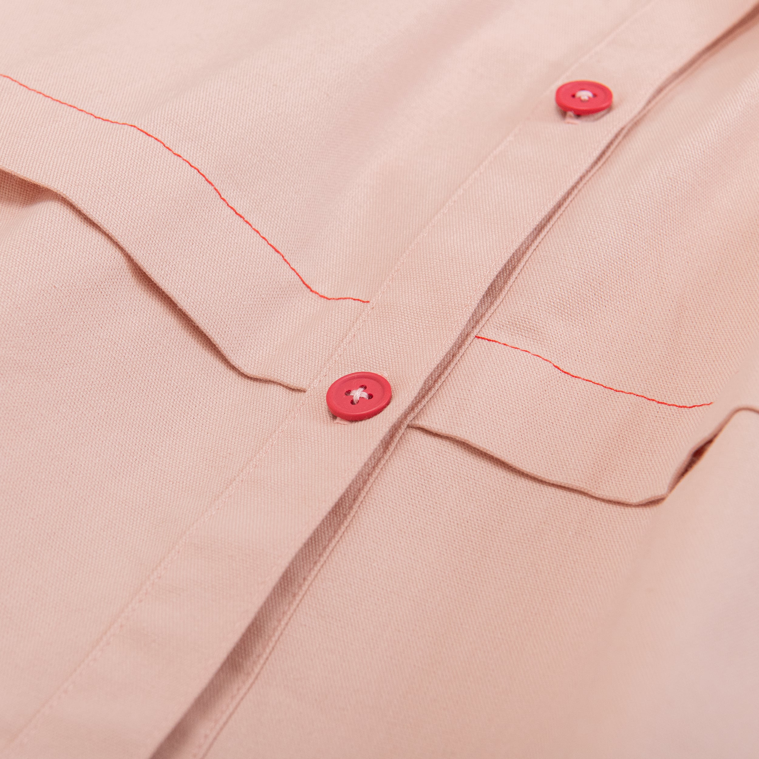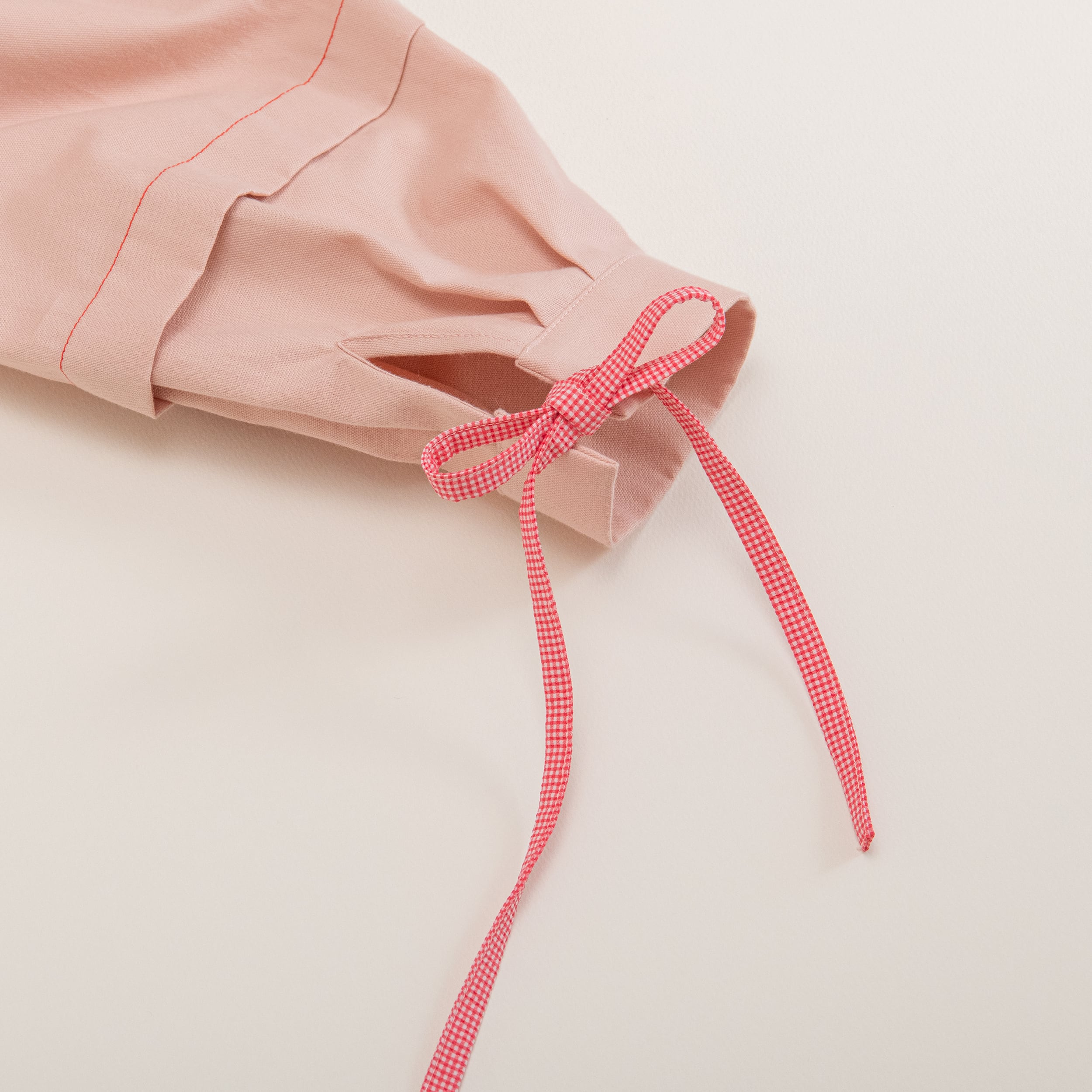 An eye-catching item with colored ribbons on the neck and cuffs and colorful buttons. The pockets are made of howtovenus' original checked fabric for a subtle accent.