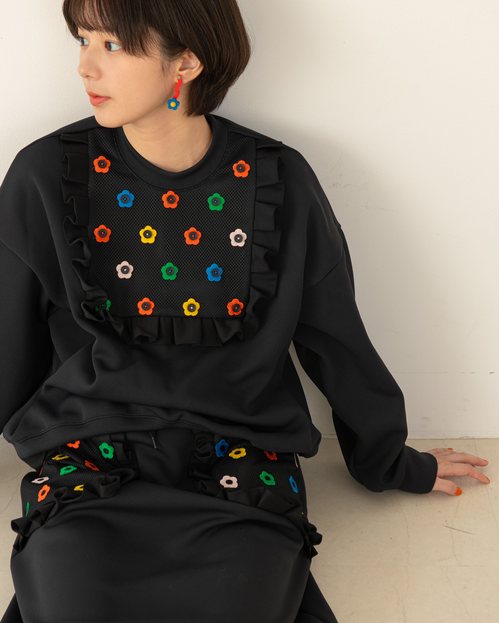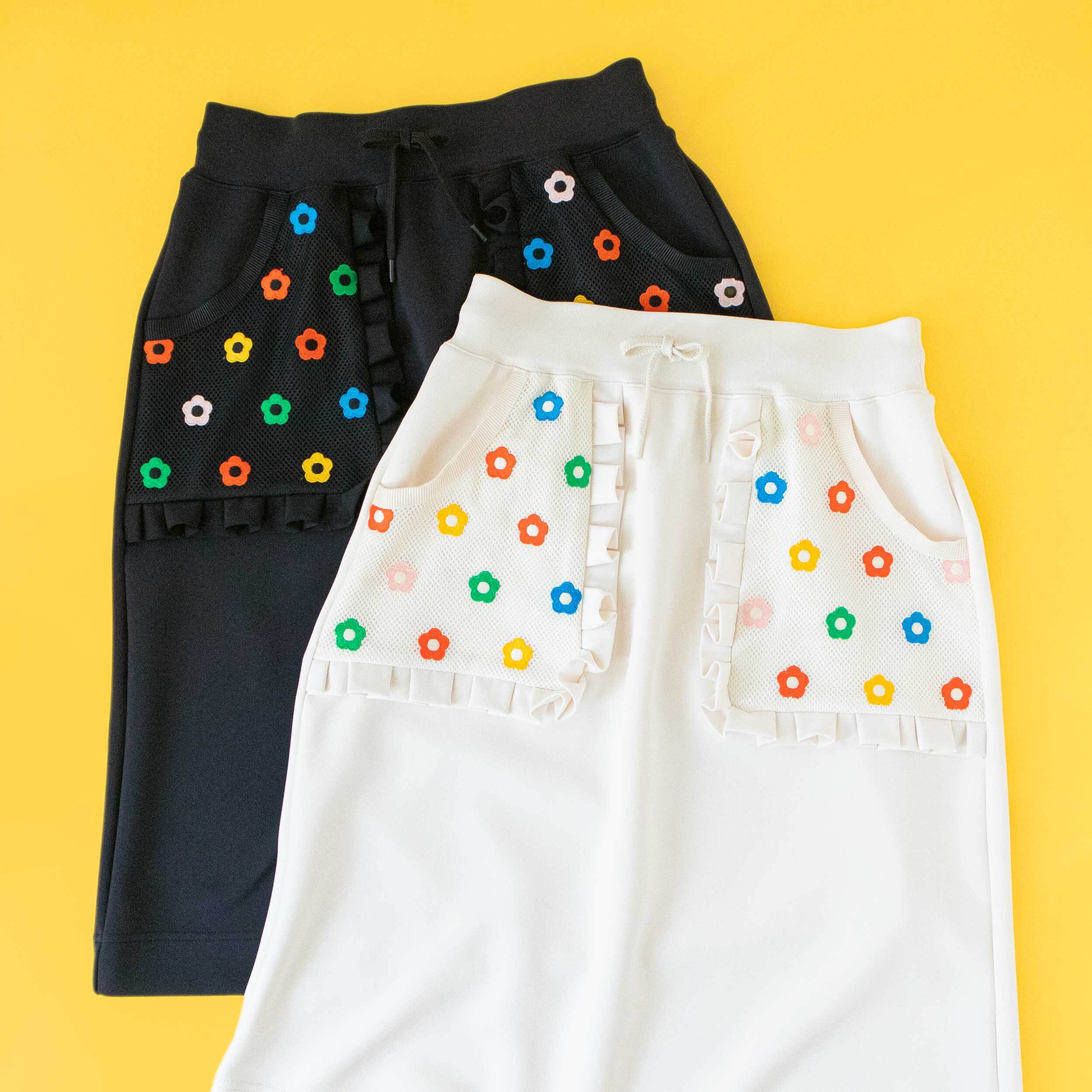 These cute sweatshirt skirts feature colorful, pop embroidery and ruffles all around!